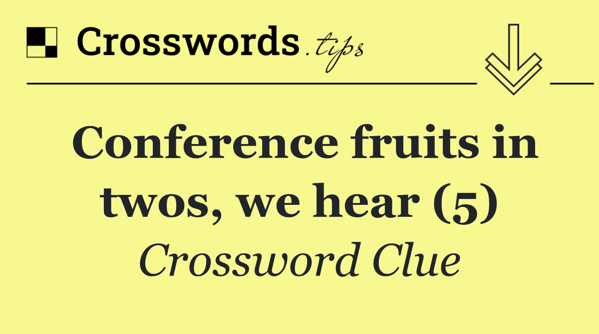 Looking for the answer to Conference fruits in twos, we hear (5) from the The Guardian Quick puzzle? We have found the exact 5-letter solution you need. Want a challenge? Use our progressive letter reveal tool, explore helpful hints like anagrams and alternative clues, or browse other clues from today's puzzle. Ready to solve it?