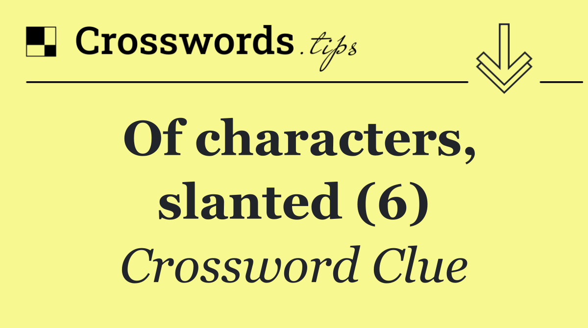 Looking for the answer to Of characters, slanted (6) from the The Guardian Quick puzzle? We have found the exact 6-letter solution you need. Want a challenge? Use our progressive letter reveal tool, explore helpful hints like anagrams and alternative clues, or browse other clues from today's puzzle. Ready to solve it?