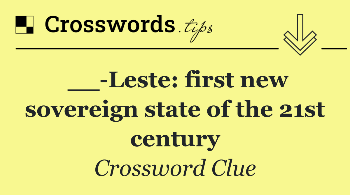Looking for the answer to __ Leste: first new sovereign state of the 21st century from the LA Times Daily puzzle? We have found the exact 5-letter solution you need. Want a challenge? Use our progressive letter reveal tool, explore helpful hints like anagrams and alternative clues, or browse other clues from today's puzzle. Ready to solve it?