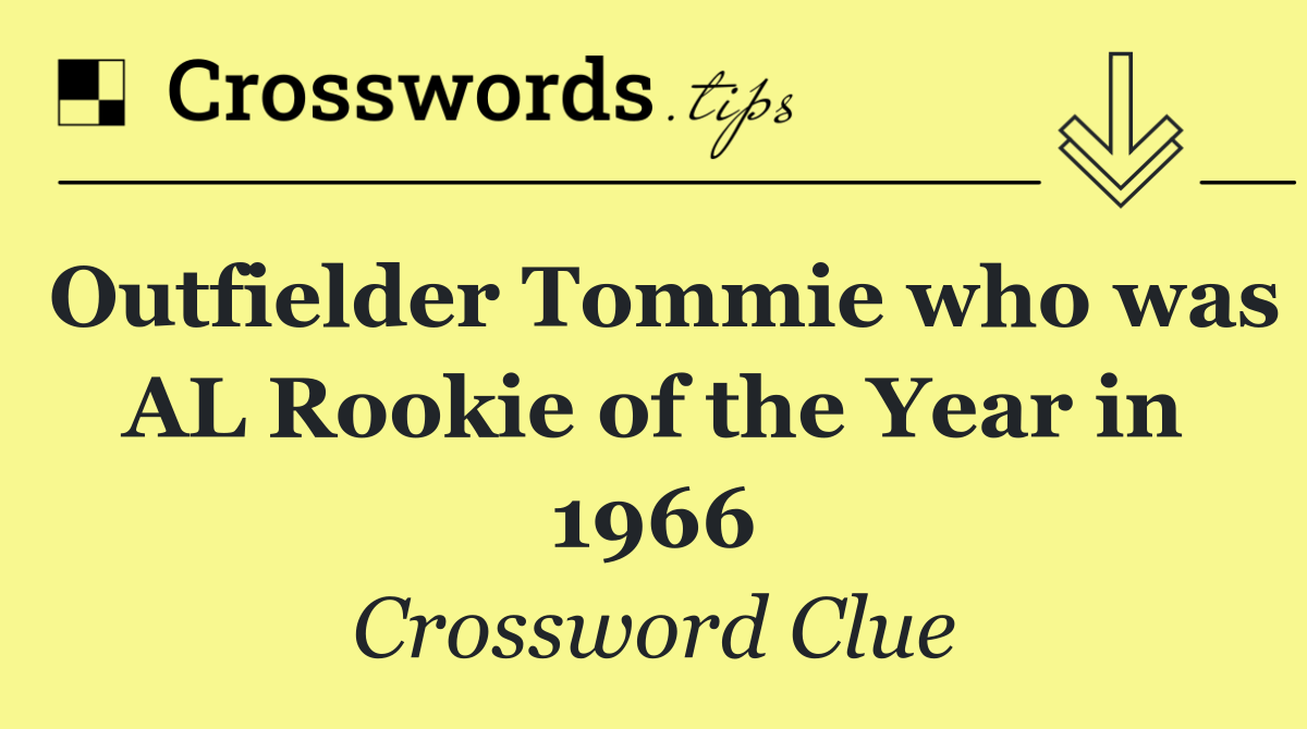 Looking for the answer to Outfielder Tommie who was AL Rookie of the Year in 1966 from the LA Times Daily puzzle? We have found the exact 4-letter solution you need. Want a challenge? Use our progressive letter reveal tool, explore helpful hints like anagrams and alternative clues, or browse other clues from today's puzzle. Ready to solve it?