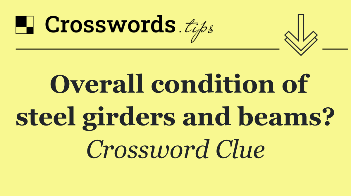Looking for the answer to Overall condition of steel girders and beams? from the LA Times Daily puzzle? We have found the exact 11-letter solution you need. Want a challenge? Use our progressive letter reveal tool, explore helpful hints like anagrams and alternative clues, or browse other clues from today's puzzle. Ready to solve it?