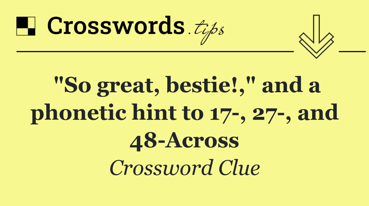 Looking for the answer to "So great, bestie!," and a phonetic hint to 17 , 27 , and 48 Across from the LA Times Daily puzzle? We have found the exact 15-letter solution you need. Want a challenge? Use our progressive letter reveal tool, explore helpful hints like anagrams and alternative clues, or browse other clues from today's puzzle. Ready to solve it?