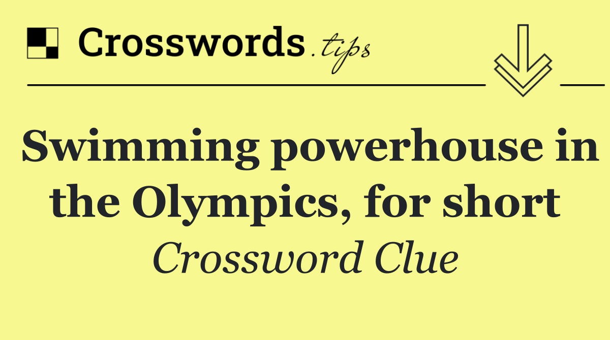 Looking for the answer to Swimming powerhouse in the Olympics, for short from the LA Times Daily puzzle? We have found the exact 3-letter solution you need. Want a challenge? Use our progressive letter reveal tool, explore helpful hints like anagrams and alternative clues, or browse other clues from today's puzzle. Ready to solve it?