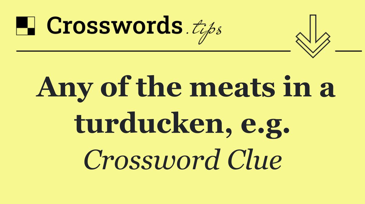 We specialize in solving many of your favorite puzzles, including the New York Times, USA Today, LA Times, Daily Themed Crosswords, and more. The "Any of the meats in a turducken, e.g." clue from the New York Times puzzle, December 22 edition, is one such example.