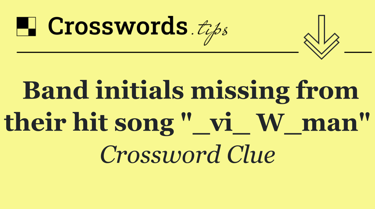 Looking for the answer to Band initials missing from their hit song "_vi_ W_man" from the New York Times puzzle? We have found the exact 3-letter solution you need. Want a challenge? Use our progressive letter reveal tool, explore helpful hints like anagrams and alternative clues, or browse other clues from today's puzzle. Ready to solve it?