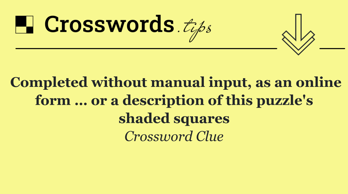 Looking for the answer to Completed without manual input, as an online form … or a description of this puzzle's shaded squares from the New York Times puzzle? We have found the exact 10-letter solution you need. Want a challenge? Use our progressive letter reveal tool, explore helpful hints like anagrams and alternative clues, or browse other clues from today's puzzle. Ready to solve it?