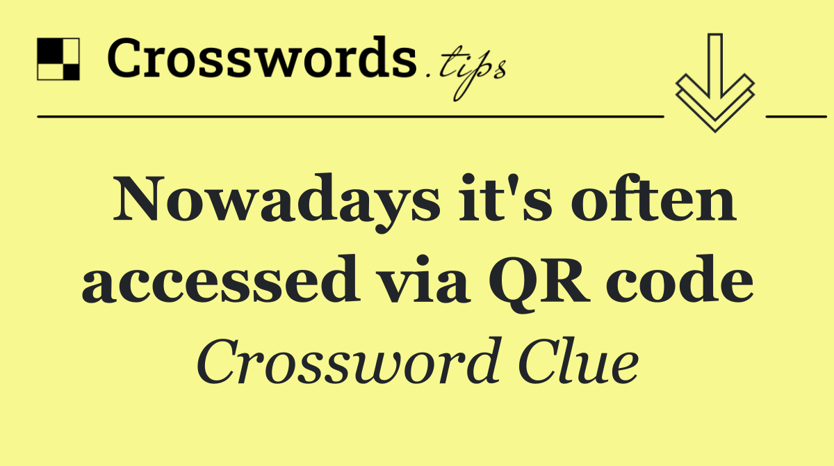 Looking for the answer to Nowadays it's often accessed via QR code from the New York Times puzzle? We have found the exact 4-letter solution you need. Want a challenge? Use our progressive letter reveal tool, explore helpful hints like anagrams and alternative clues, or browse other clues from today's puzzle. Ready to solve it?
