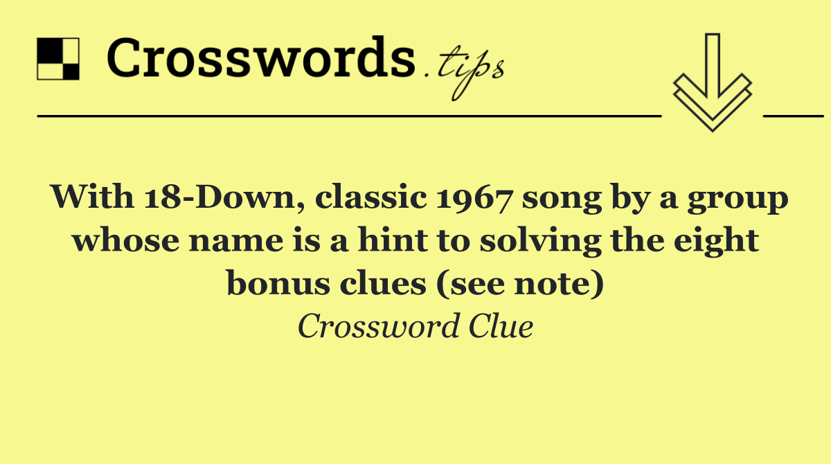 Looking for the answer to With 18 Down, classic 1967 song by a group whose name is a hint to solving the eight bonus clues (see note) from the New York Times puzzle? We have found the exact 14-letter solution you need. Want a challenge? Use our progressive letter reveal tool, explore helpful hints like anagrams and alternative clues, or browse other clues from today's puzzle. Ready to solve it?