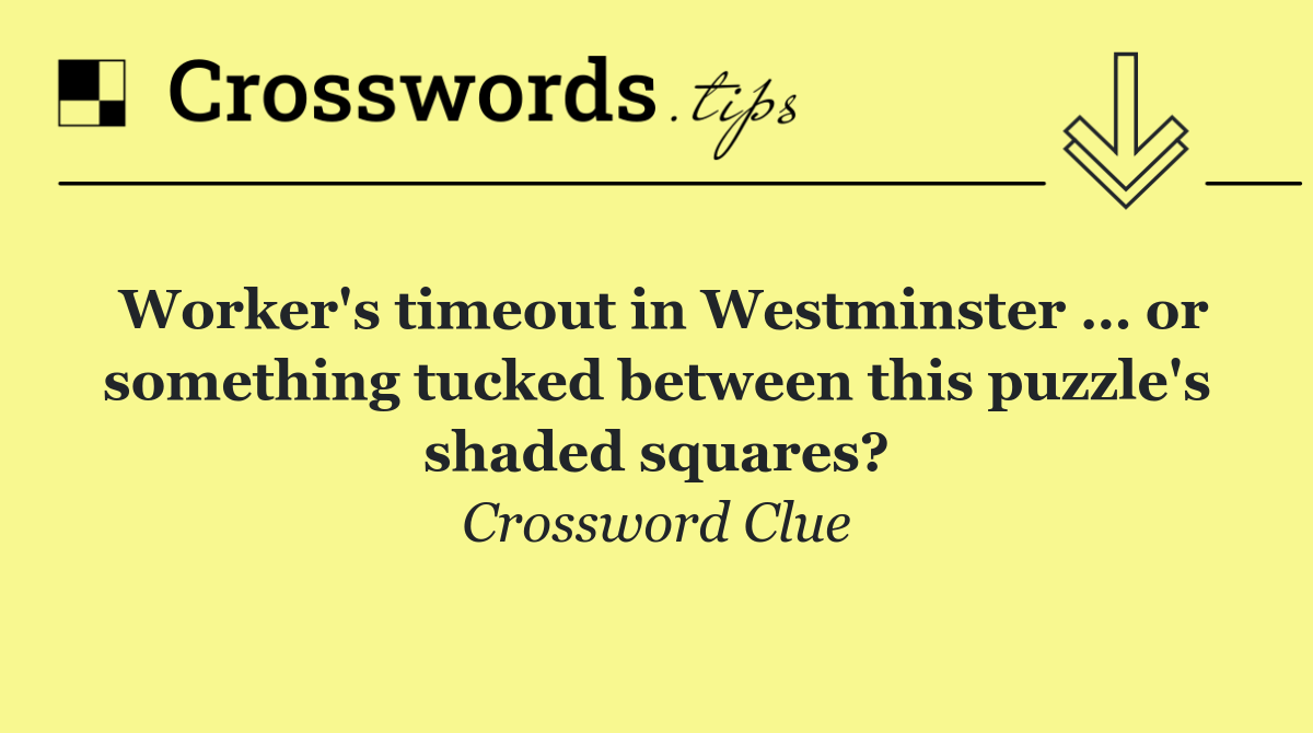Looking for the answer to Worker's timeout in Westminster … or something tucked between this puzzle's shaded squares? from the New York Times puzzle? We have found the exact 8-letter solution you need. Want a challenge? Use our progressive letter reveal tool, explore helpful hints like anagrams and alternative clues, or browse other clues from today's puzzle. Ready to solve it?