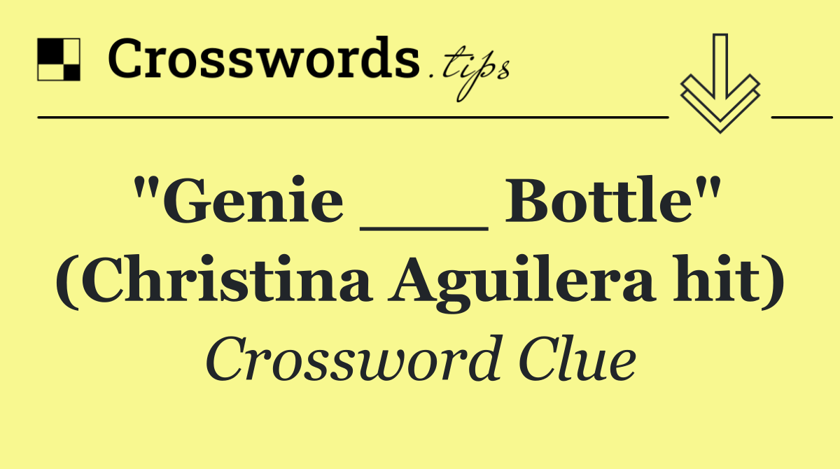 Looking for the answer to "Genie ___ Bottle" (Christina Aguilera hit) from the USA Today puzzle? We have found the exact 3-letter solution you need. Want a challenge? Use our progressive letter reveal tool, explore helpful hints like anagrams and alternative clues, or browse other clues from today's puzzle. Ready to solve it?
