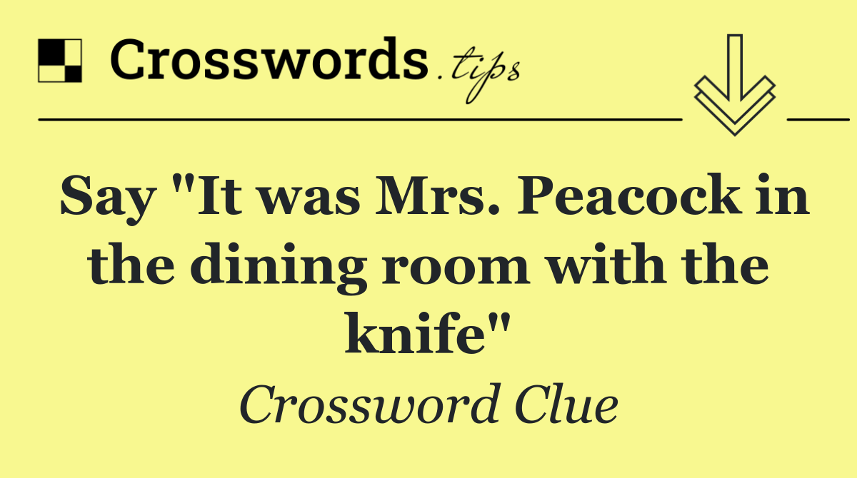 Looking for the answer to Say "It was Mrs. Peacock in the dining room with the knife" from the USA Today puzzle? We have found the exact 6-letter solution you need. Want a challenge? Use our progressive letter reveal tool, explore helpful hints like anagrams and alternative clues, or browse other clues from today's puzzle. Ready to solve it?
