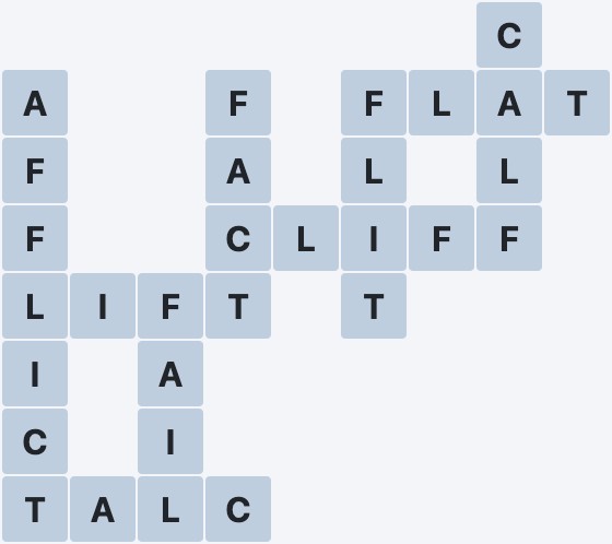 Wordscapes Level 1296 from the Wood Pack in the Fog Group features the letters ACFILT. These letters can be combined to form 9 words: AFFLICT, CALF, CLIFF, FACT, FAIL, FLAT, FLIT, LIFT and TALC. In addition to these words, there are 3 exciting bonus words to uncover. This makes Level 1296 both challenging and entertaining for all Wordscapes players.