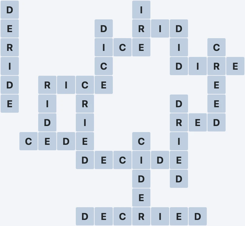 Wordscapes Level 1600 from the Arch Pack in the Outback Group features the letters CDEIR. These letters can be combined to form 17 words: CEDE, CIDER, CREED, CRIED, DECIDE, DECRIED, DERIDE, DICE, DID, DIRE, DRIED, ICE, IRE, RED, RICE, RID and RIDE. In addition to these words, there are 16 exciting bonus words to uncover. This makes Level 1600 both challenging and entertaining for all Wordscapes players.