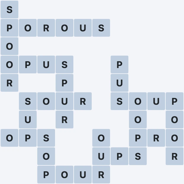 Wordscapes Level 1615 from the White Pack in the Frost Group features the letters OPRSU. These letters can be combined to form 16 words: OOPS, OPS, OPUS, OUR, POOR, POROUS, POUR, PRO, PUS, SOP, SOUP, SOUR, SPOOR, SPUR, SUP and UPS. In addition to these words, there are 5 exciting bonus words to uncover. This makes Level 1615 both challenging and entertaining for all Wordscapes players.