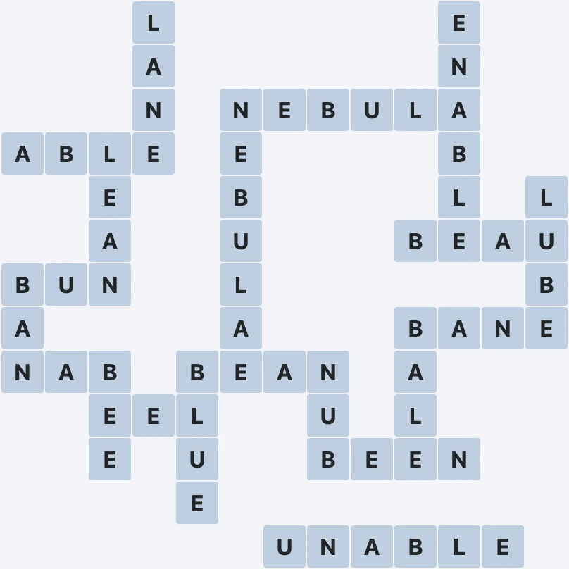 Wordscapes Level 1932 from the Calm Pack in the Formation Group features the letters ABELNU. These letters can be combined to form 20 words: ABLE, BALE, BAN, BANE, BEAN, BEAU, BEE, BEEN, BLUE, BUN, EEL, ENABLE, LANE, LEAN, LUBE, NAB, NEBULA, NEBULAE, NUB and UNABLE. In addition to these words, there are 10 exciting bonus words to uncover. This makes Level 1932 both challenging and entertaining for all Wordscapes players.