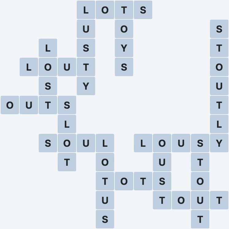 Wordscapes Level 3472 from the Gaze Pack in the Starlight Group features the letters LOSTUY. These letters can be combined to form 15 words: LOST, LOTS, LOTUS, LOUSY, LOUT, LUSTY, OUST, OUTS, SLOT, SOUL, STOUT, STOUTLY, TOTS, TOUT and TOYS. In addition to these words, there are 4 exciting bonus words to uncover. This makes Level 3472 both challenging and entertaining for all Wordscapes players.