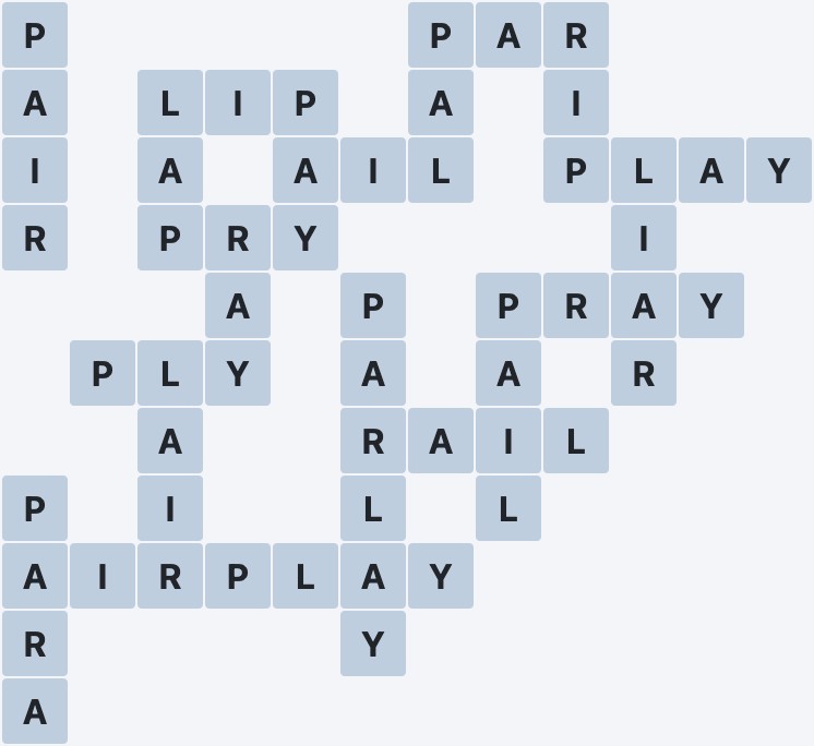 Wordscapes Level 840 from the Storm Pack in the Ocean Group features the letters AILPRY. These letters can be combined to form 20 words: AIL, AIRPLAY, LAIR, LAP, LIAR, LIP, PAIL, PAIR, PAL, PAR, PARA, PARLAY, PAY, PLAY, PLY, PRAY, PRY, RAIL, RAY and RIP. In addition to these words, there are 8 exciting bonus words to uncover. This makes Level 840 both challenging and entertaining for all Wordscapes players.